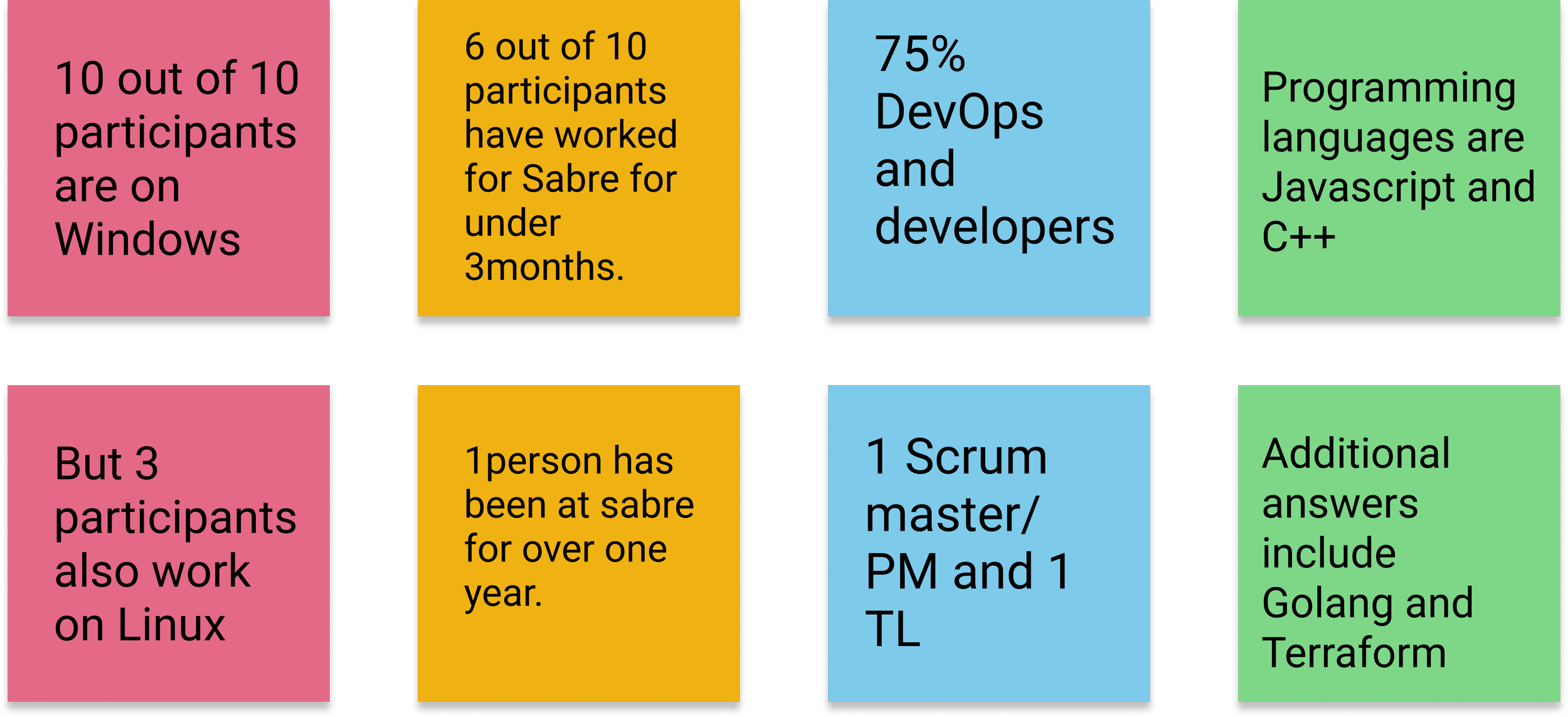 We decided to create a workshop using Miro (an online whiteboard tool)Because this was an internal study amongst Sabre employees, the recruitment of the workshop participants was very efficient. I communicated with 3 technical managers who asked the developers on their teams if they were interested in participating.
